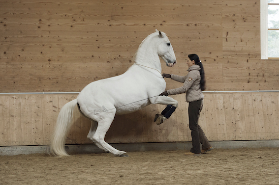 Sämtliche Bewegungen, die in der Dressur verlangt werden, sind der Natur abgeschaut, diese gibt die Form vor. Deshalb kann der Lustiano-Wallach Ole eine Levade in perfekter Haltung auch ohne Zaum zeigen.))